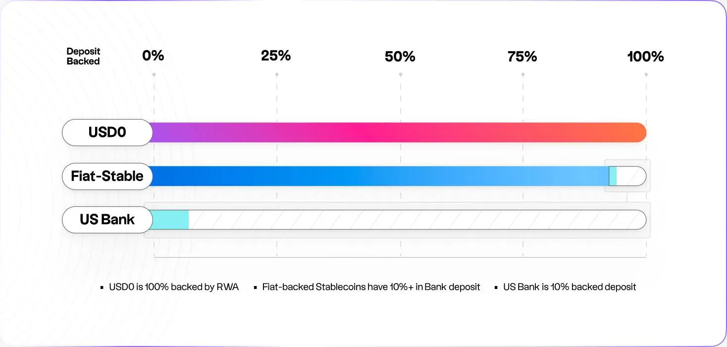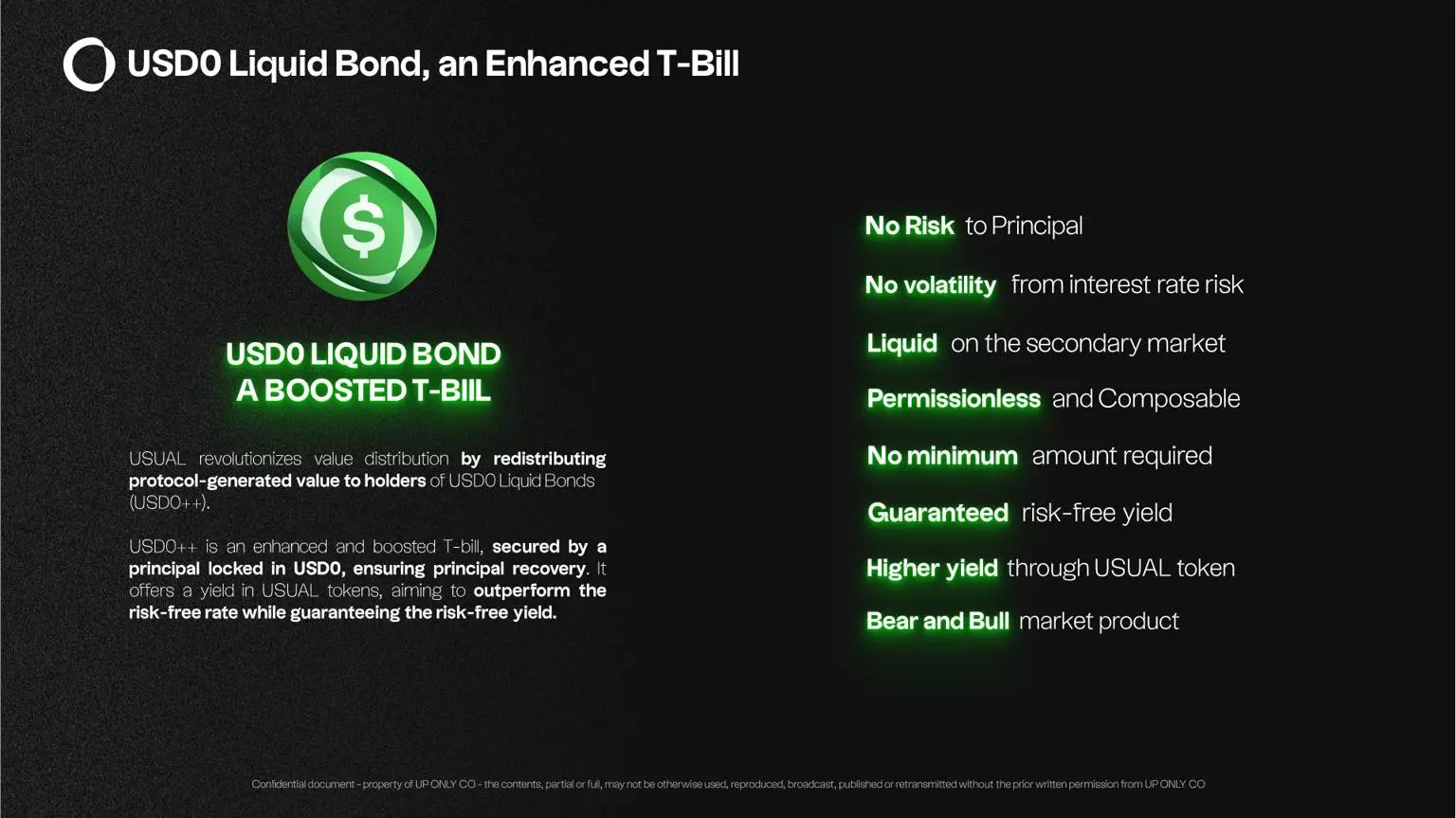USD0 是 Usual 生态系统的基石,它是世界上首个聚合多种美国国债代币的 RWA 稳定币。这种设计使 USD0 成为一个安全、破产隔离的解决方案,不依赖于传统银行存款,从而避免了传统金融系统可能带来的系统性风险。