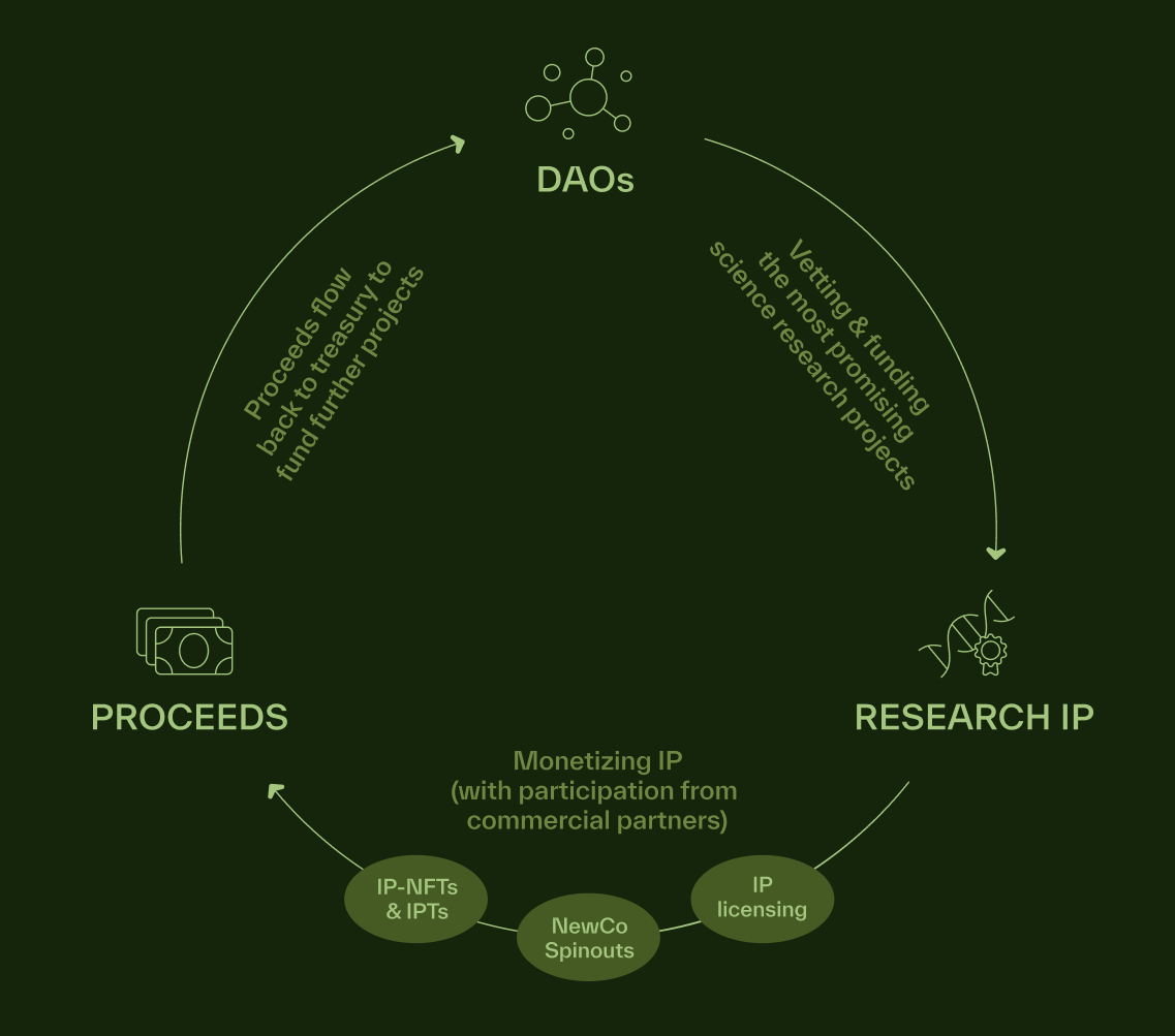 其中,知识产权代币(「IP-Tokens」或「IPT」)代表了对所产生的知识产权(IP)的部分治理权。这些代币使持有者有机会直接参与研究的开发,决策和未来方向。
