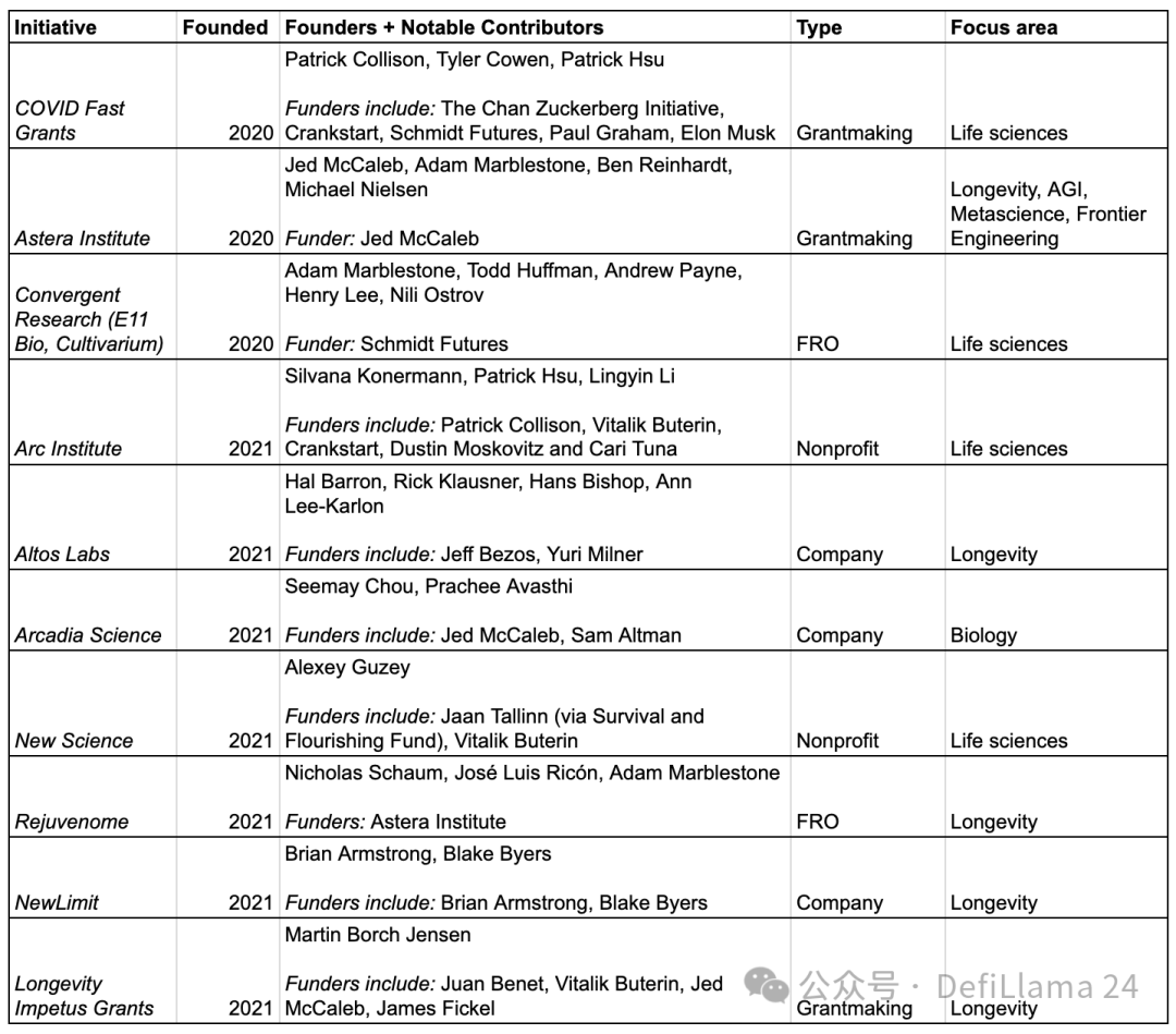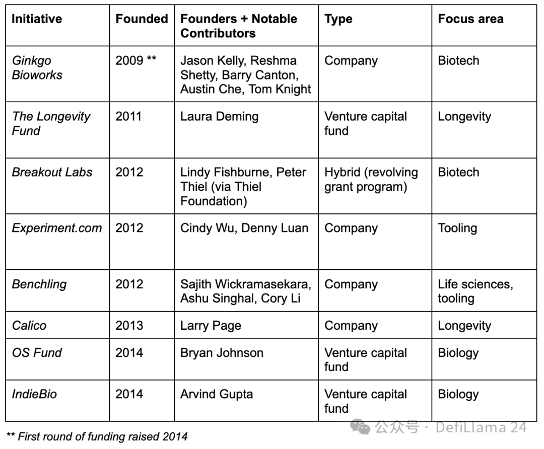 除了 Breakout Labs(虽然是一个资助项目,但被构建为一个循环基金,收入来自受资助者的知识产权和 / 或版税)之外,当时著名的科学项目通常是初创公司或风险投资基金。例子包括: