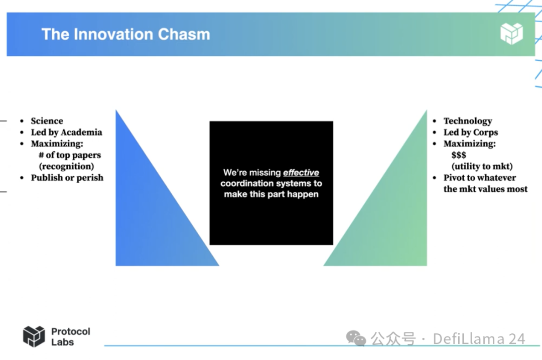 在 2021 年由 Protocol Labs 主办的关于资助公共产品的虚拟会议「Funding the Commons」上,创始人 Juan Benet 发表了一个关于「跨越创新鸿沟」的演讲。他指出,在过去十年里,创业生态系统通过将新技术产品化,在研发创新方面取得了显著成果。从他的角度来看,Y Combinator 对研发创新的贡献远远超过了 Alphabet 或 Ethereum。