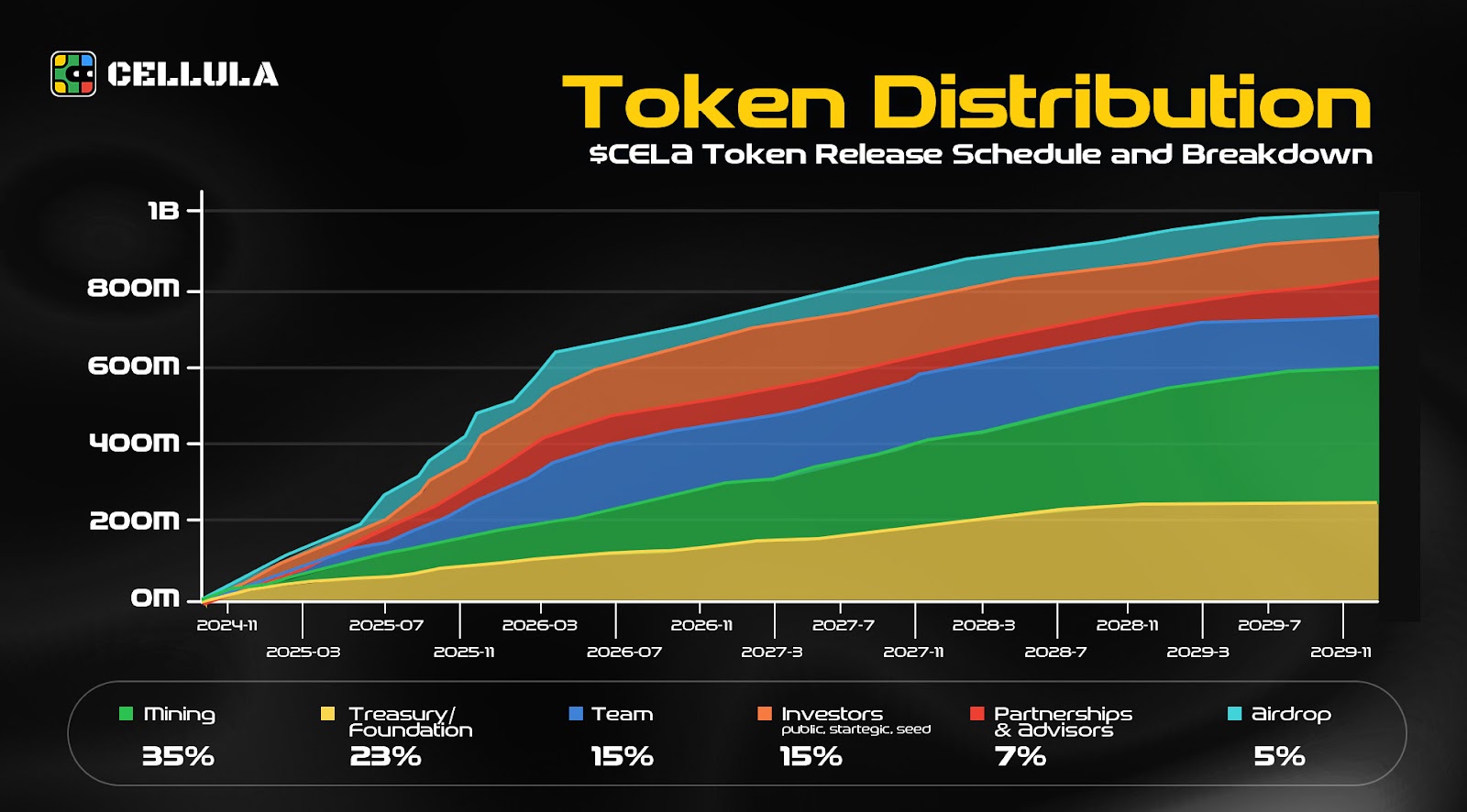Cellula(CELA)代币是该项目的原生代币,旨在为去中心化金融和可编程激励提供创新的解决方案。代币总供应量为1,000,000,000 CELA,其中LBank Launchpool活动中的代币供应量为1,428,571 CELA(约占总供应量的0.14%)。