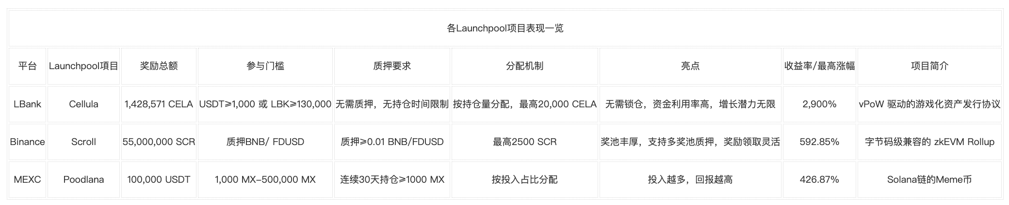 通过研究表明,与其他平台的Launchpool项目相比,LBank的首个Launchpool项目Cellula表现较为亮眼。LBank数据显示,LBank的Cellula项目已经超过了币安近期launchpool上的Scroll项目以及MEXC近期launchpool上的Poodlana项目,目前已实现2,900%的最高涨幅,展现出强大的市场吸引力。