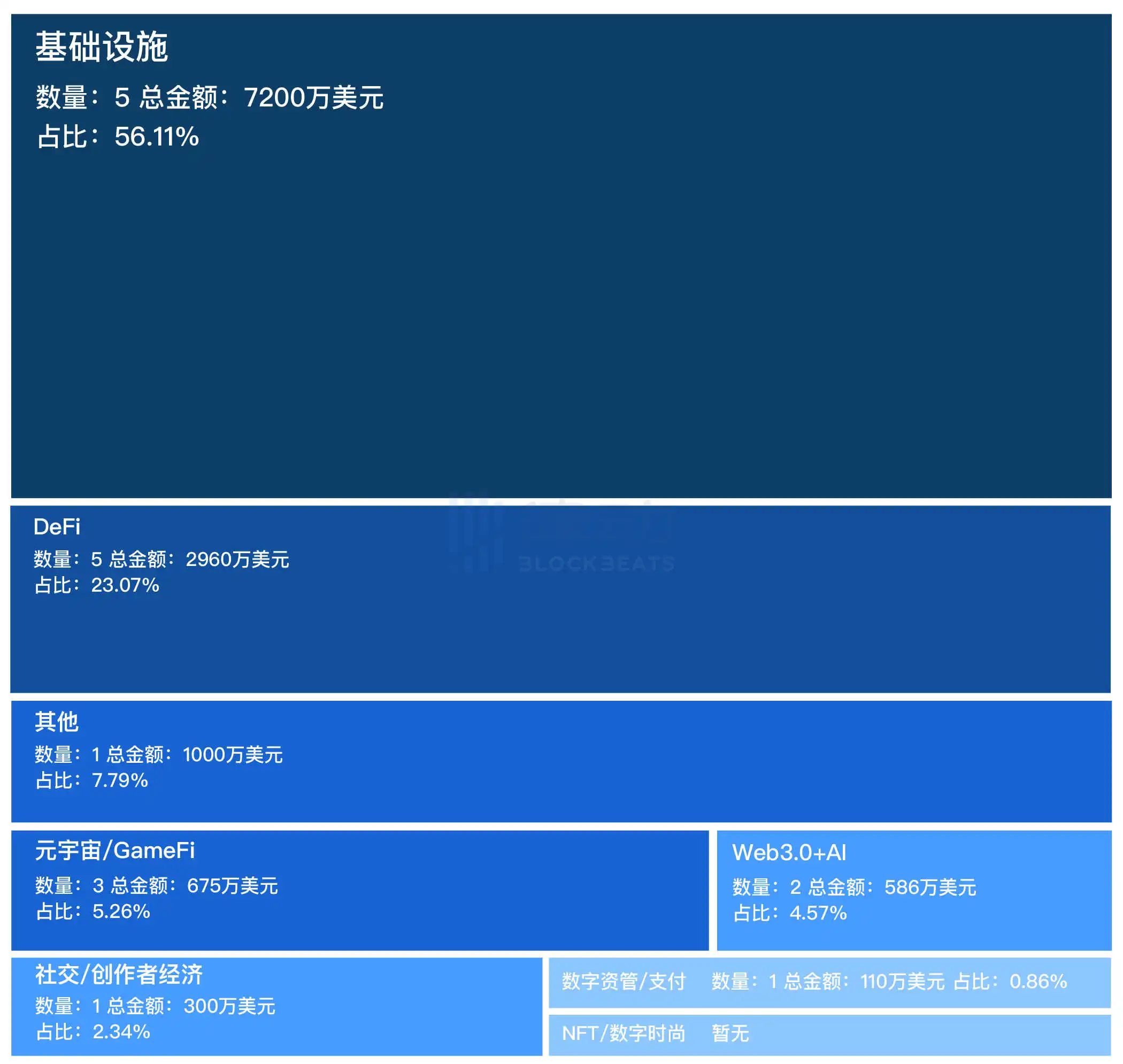 上周的融资总数为 18 笔,数量较之前减少,总金额约为 12831 万美元,平均融资金额为 712.83 万美元。其中,基础设施领域占据主体,DeFi 领域和其他领域融资相对较多,元宇宙/GameFi 领域和 Web3.0+AI 领域增多,社交/创作者经济领域和数字资管/支付领域较少,NFT/数字时尚领域暂无。下图为上周各板块融资占比: