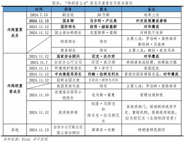 11月6日,特朗普宣布赢得大选,并启动“特朗普2.0”内阁成员和重要官员提名工作。截至11月14日,外交、国防、司法等领域团队雏形基本形成,财政部长、商务部长和美国贸易代表等重要位置尚未确定人选。