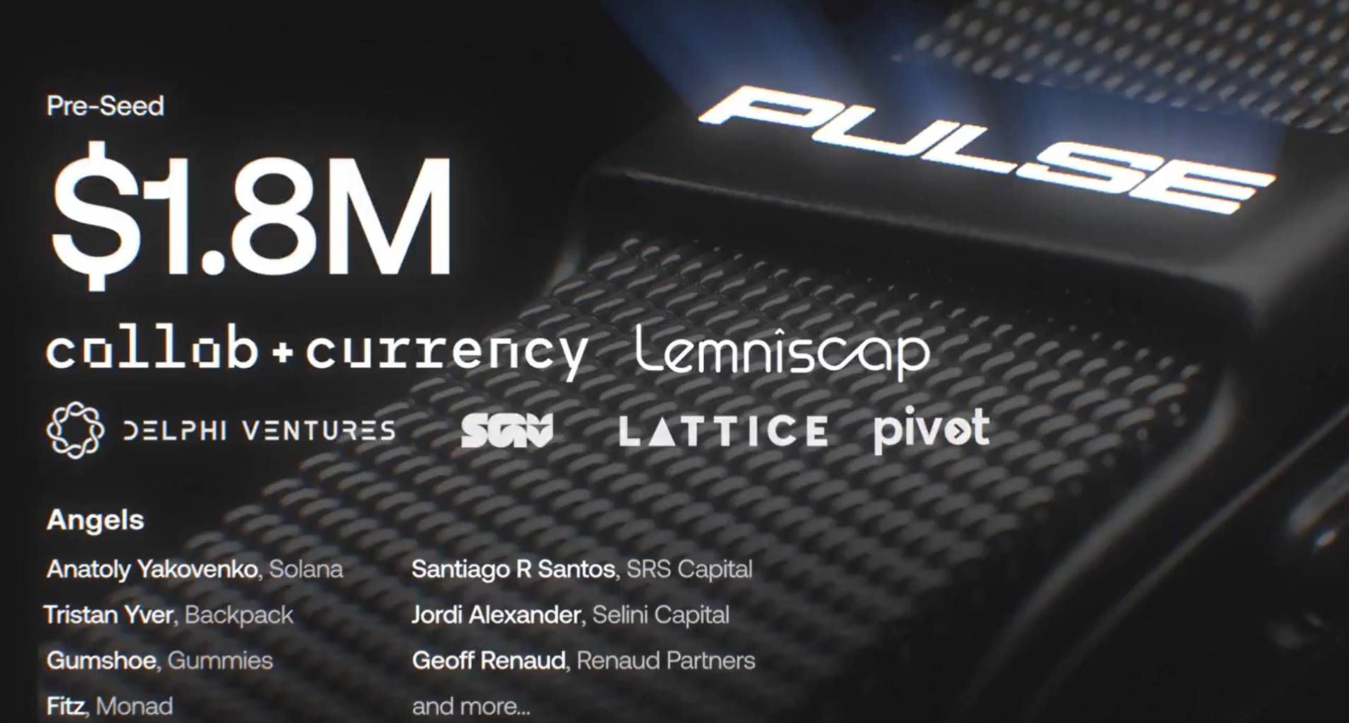 当前 PULSE 已完成180万美元种子轮融资,投资方包括 Lemniscap 和 Collab Currency。项目计划于 2025 年第一季度推出产品,并着手建立数据共享生态系统。