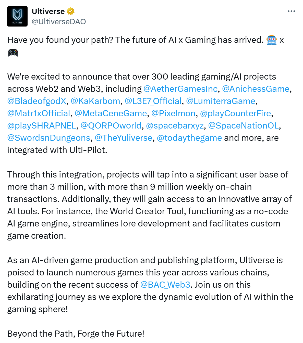 Ultiverse 作为 Web3 游戏+AI 的结合体,在本轮牛市周期中具有天然优势,在 22 - 23 年熊市中,团队不断交付令人印象深刻的产品,同时也培育了一个有凝聚力的社区,叠加强大的投资背景和优秀的团队,以及丰富的合作伙伴支持。在尚未爆发的 GameFi 赛道中属于佼佼者,潜力巨大,值得长期期待和关注!