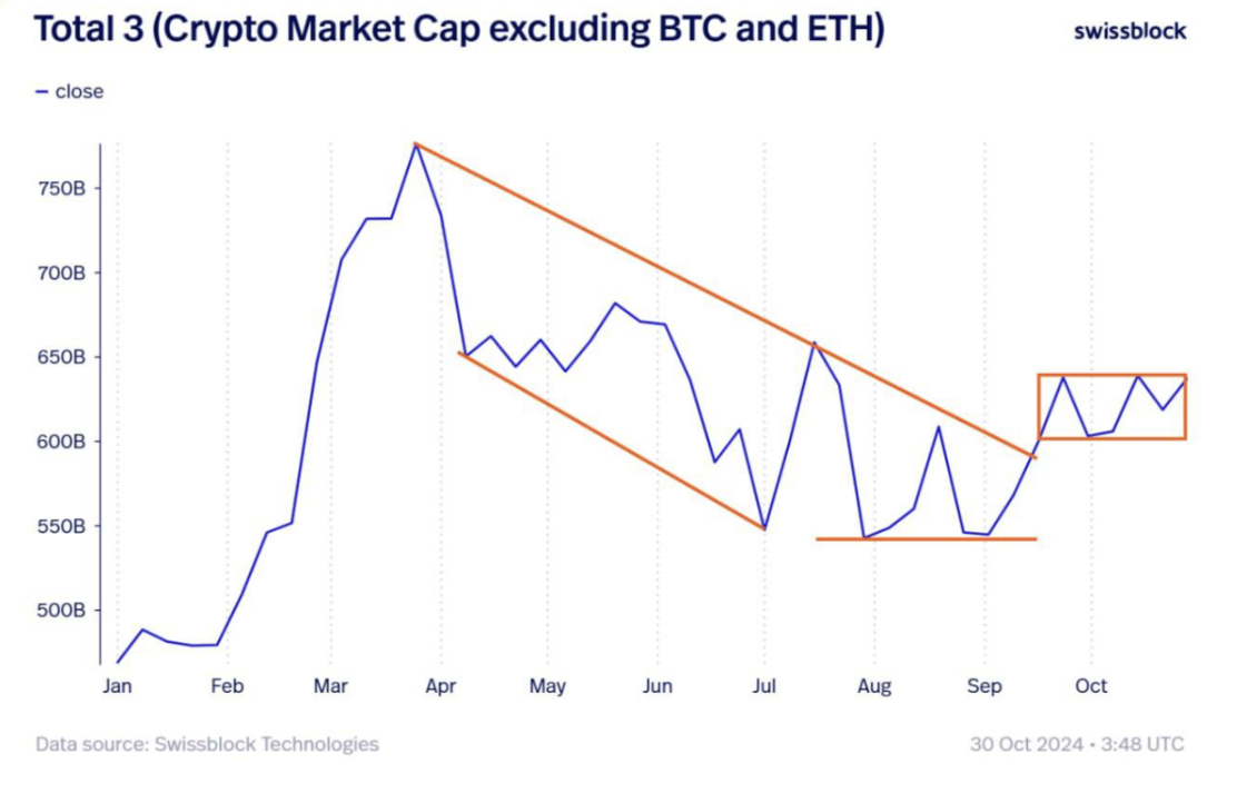 下图为今年以来排除比特币与以太币的加密市场总市值变化 (Total 3),该图也代表山寨币能够爆发与否。可以看到在今年 4 - 9 月期间,整体山寨币市值呈现大幅下跌趋势,由 7500 亿美元跌至 5500 亿美元,但从九月开始,可以在图表上看到市值止跌回升,从 5500 亿美元上升至 6000 ~ 6500 亿美元区间,打破了下降趋势,也代表我们已经度过山寨币最低迷的时期。