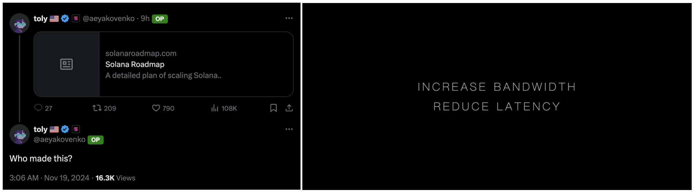 有人制作了一个名为 Solana 路线图的网站,打开显示「增加带宽,减少延迟」,Anatoly 询问这是谁做的
