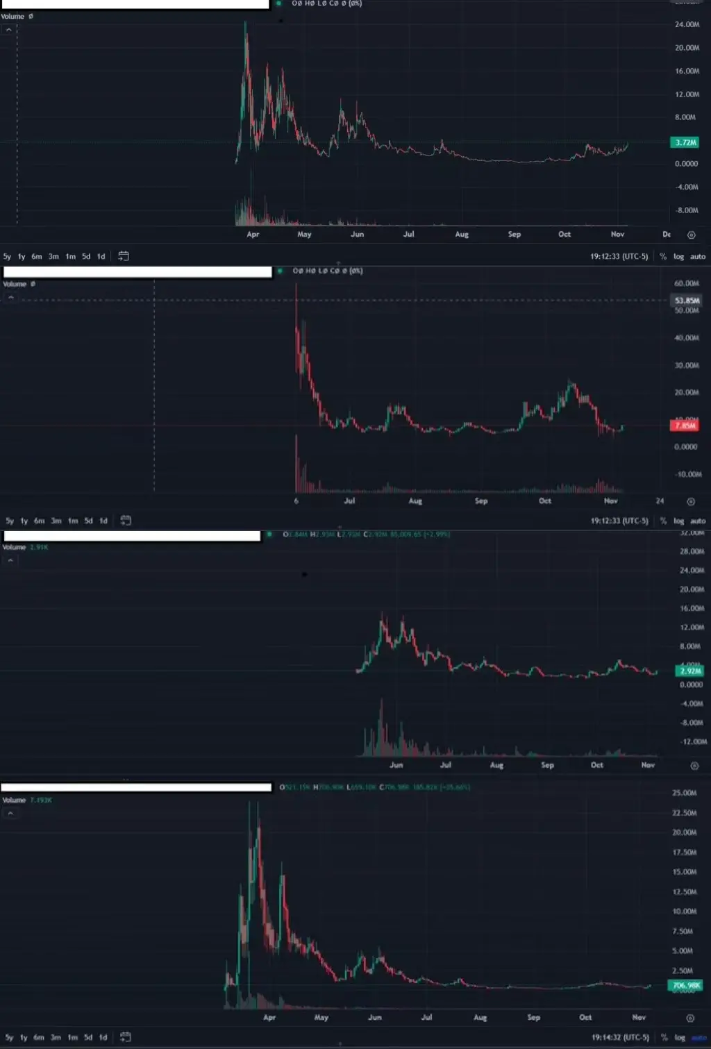 目前,Base 上的大多数代币都处于周期低点——并且我不会提供任何代币名称或推荐,但可以看到一些图表示例,这些是我随机选择的。