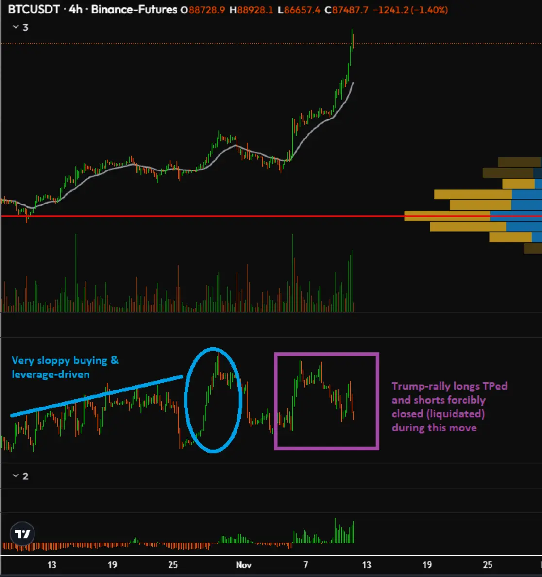 主要资产表现支持了这一趋势——买盘主要通过现货驱动,ETH 和 BTC 的未平仓合约(OI)大多已重置至选举前水平,融资利率的攀升主要源于缺乏新的空头建立(以及最近几天突破的水平——空头爆仓金额已达到 10 亿美元,这是今年的最高值),而非过度杠杆的使用。