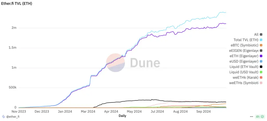 eETH占据了Etherfi TVL的90%,给Etherfi贡献了高峰时超过60亿美元的TVL,以及最高80亿美元的FDV,也使得Etherfi在短短半年内就成为了第四大质押实体。