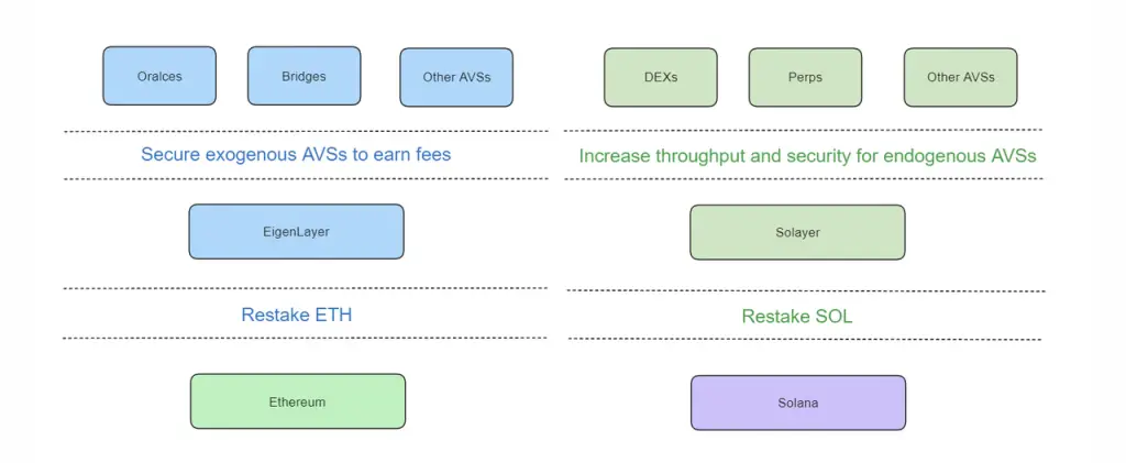在swQoS的背景之下,Solayer的restaking的目标用户并不是预言机或桥,而是对交易通过性/可靠性有需求的协议,典型如DEX。因而Solayer将Eigenlayer所提供的AVS服务称为外源性AVS(Exogenous AVS),因为Eigenlayer服务的这些系统通常位于Ethereum主链之外。而自己所提供的服务,称之为内源性AVS(Endogenous AVS),因为其服务对象位于solana主链之内。