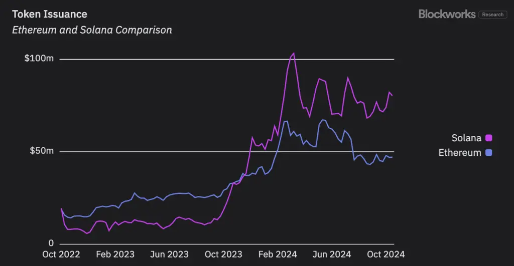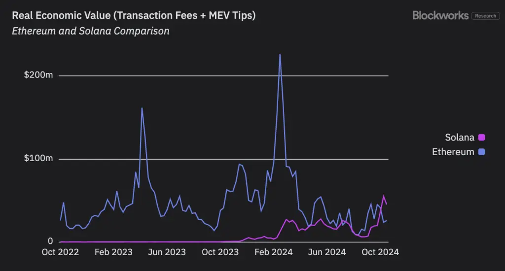2. 交易排序收益方面:Blockworks使用交易费和MEV小费来反映一条链的真实经济价值(REV,Real Economic Value),这个指标近似能反映一条链所能获得交易排序收益的最大值,我们可以看到,尽管两条链REV的波动都较大,但以太坊的REV在坎昆升级之后急速下降,而Solana的REV则总体呈现上升趋势,并于近期成功超过了以太坊。