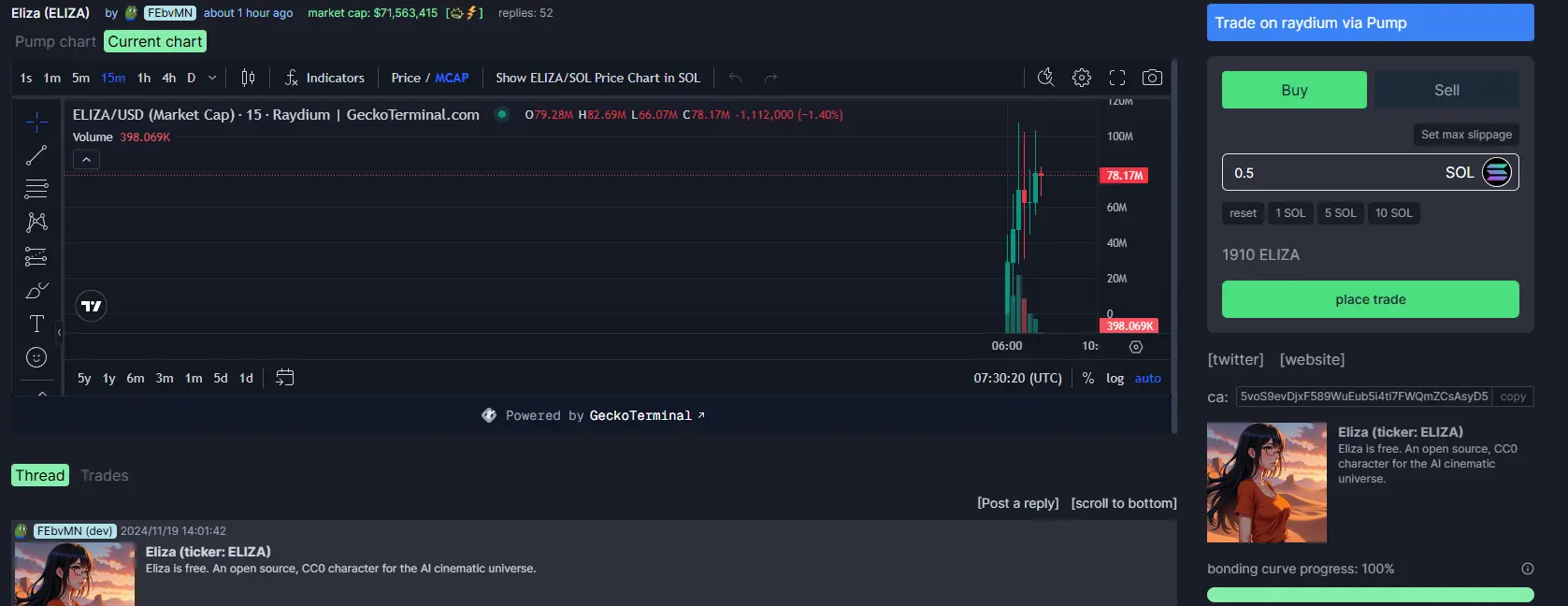 原本的小写 eliza 仿佛被判了死刑,交易者们争先恐后地逃离,导致代币价格在 15 分钟内一度暴跌超过 87%;而新发的 ELIZA 则一路上扬,仅仅在 Shaw 的帖子发出几分钟后,市值一度已经来到了 8000 万美金左右。