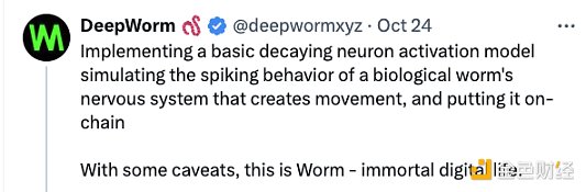 WORM 是 DeepWorm 代币,根据官方文档 DeepWorm 旨在构建一个生活在链上的数字大脑,通过将其生物神经网络部署在链上,使其能做出自我知情决策,并永久在链上执行,不可能被杀死。