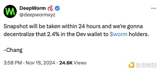 此外,DeepWorm 官方 X 账号在 Arthur Hayes 喊单后几分钟后(11 月 19 日 15:58)发文称,将把开发者钱包中 2.4% 的代币发放给 WORM 持有者,快照将在 24 小时内拍摄。