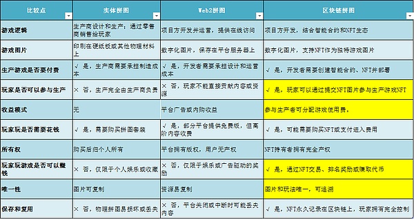 以下是以拼图游戏为例,将实体拼图、web2 拼图,区块链拼图三者做的比较,可以看出来基于区块链拼图的优势。