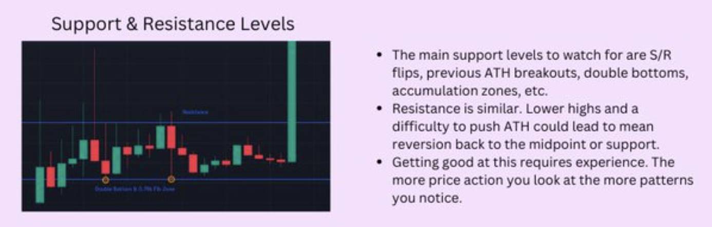 主要的支撑水平包括支撑/阻力(S/R)转换、先前的 ATH 突破、双底形态、积累区域等。