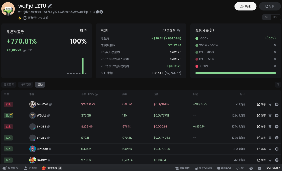 你也可以点开任何一个聪明钱地址界面,有更详细的信息,包括持仓分析、盈亏分布、交易活动等。