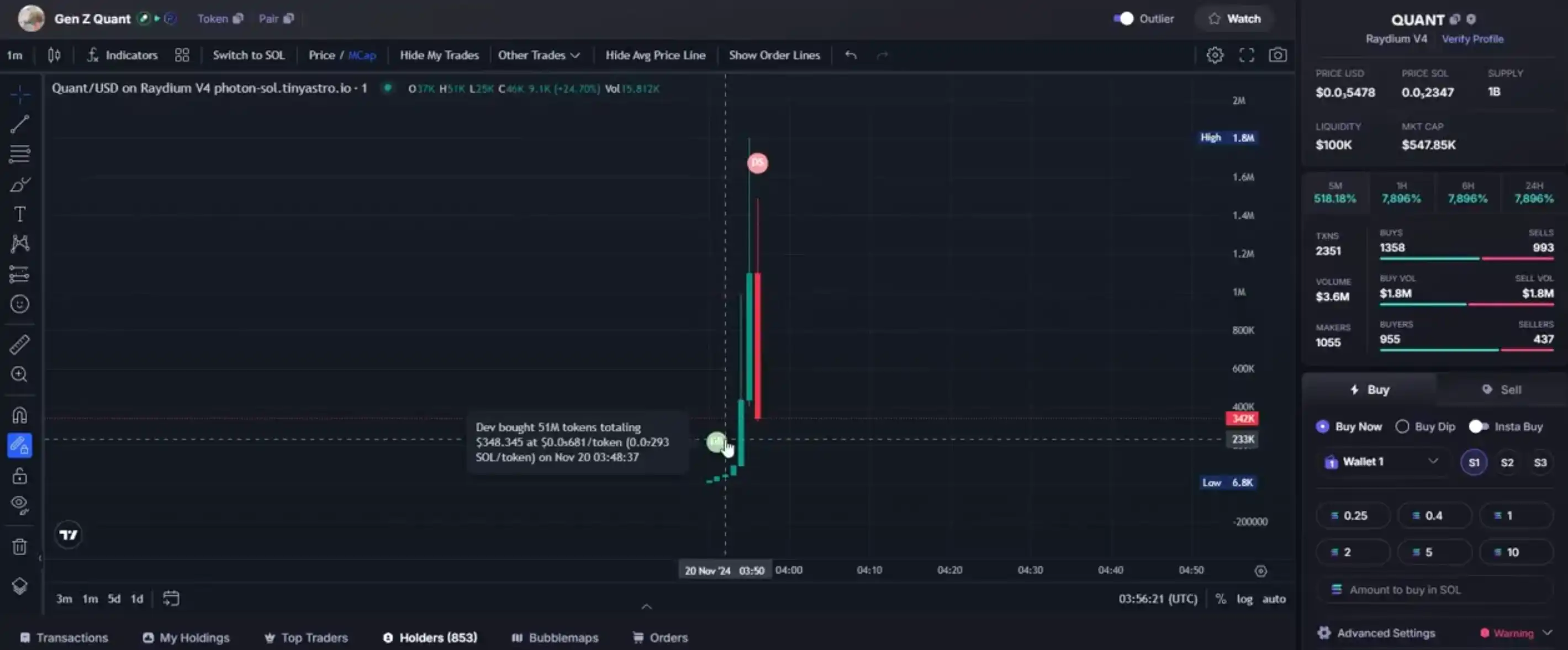 圈子里之前也发生过「小孩哥」发币或发 NFT 大获成功的例子,但这次我们碰到的是一个「邪恶小孩哥」。在直播启动这个名为 $QUANT 的代币后不久,「邪恶小孩哥」就按下了卖出按钮,直接把大家都给 Rug 了。