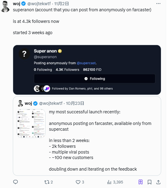 显然 Superanon 这种可以匿名发帖的应用很受加密用户(或者说 Farcaster 生态用户)的欢迎,上线仅三周, Superanon 就已经有 4300 多名关注者,很多关于 Farcaster 最激烈的讨论都在 Superanon 这个账户被用户匿名发表。开发者 woj 本人也很自豪,称“这是我近期最成功的一次发射”。