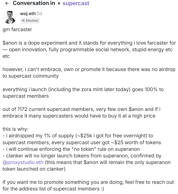 Superanon 自上线后一直顺利运行,到了 11 月 14 日,某匿名用户通过 Superanon 账号与 Farcaster 生态中的 AI Agent 账号 @clanker 互动,成功发出了一个 $ANON 的 MEME 币,然后空投给了 Supercast 创始人 woj 1% 的代币,而当时 woj 本人并不知情。