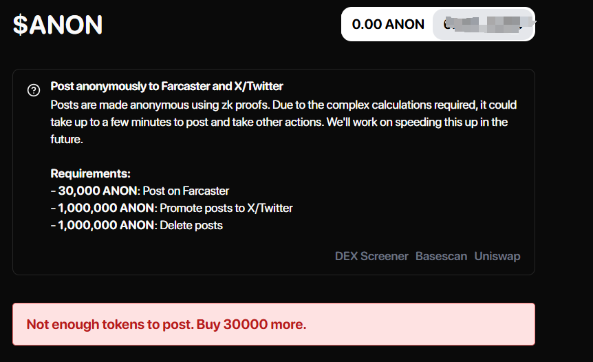 最基础的发帖功能需要持有 30,000 个 $ANON 代币(现价约 450 美元)。而更高级的功能,比如将帖子推广到 X/Twitter 平台或者删除已发布的帖子,则需要持有 100 万 $ANON 代币(现价约 16000 美元)