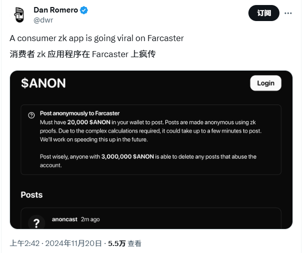 故事开始于波兰籍开发者 woj(@wojtekwtf)在 2024 年 10 月基于 Farcaster 协议创建的应用社交产品 Supercast。Supercast 是和 Base 生态头部社交产品 Warpcast 一样的平级应用层。Supercast 引入了一个名为 Superanon 的匿名发帖功能,通过 zk 证明技术支持用户通过 SuperAnon 账号进行匿名发帖,只是需要支付 10U/月 的会员费。