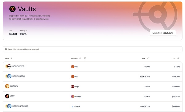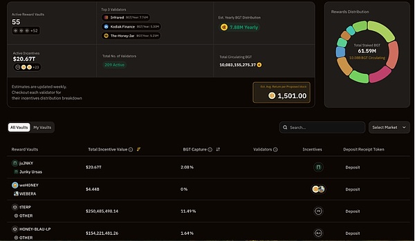 更多的项目交互,BGT Station上的Vaults是个很好的参考,不同的Vault对应不同的交互项目,可以根据BGT Capture指标判断项目热度,进行交互获取对应代币后存入Station进行收益。