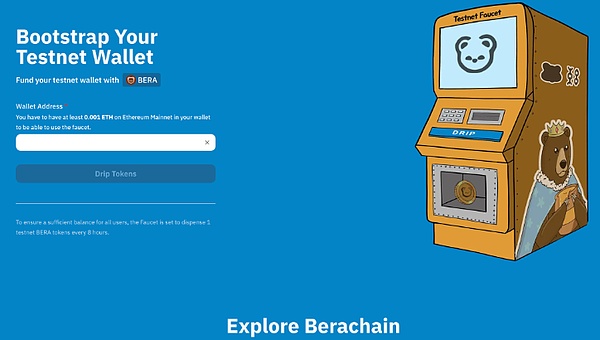 参与交互需要先从https://bartio.faucet.berachain.com/领取测试币,做了小小的门槛过滤,领取地址需要在主网至少拥有0.001ETH的余额,相比前期测试网“一水难求”的情景,这轮测试网领水已经非常丝滑。