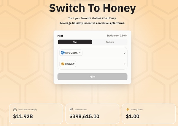 建议将$BERA兑换成稳定币Dai或者STGUSDC,在HONEY中用于铸造稳定币$HONEY。