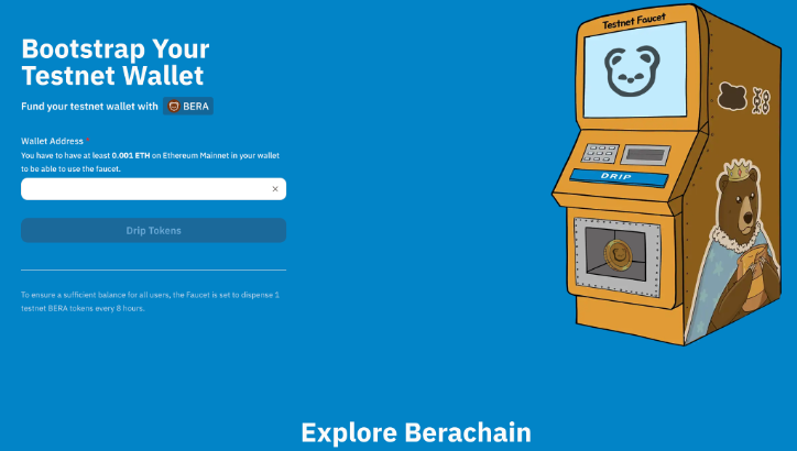 参与交互需要先从 https://bartio.faucet.berachain.com/ 领取测试币,做了小小的门槛过滤,领取地址需要在主网至少拥有 0.001ETH 的余额,相比前期测试网「一水难求」的情景,这轮测试网领水已经非常丝滑。