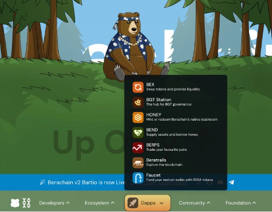 Berachain 正在运行第二版测试网 Bartio,最基本的交互参与可以参考官网的 Dapps 界面,如前文所述,都是 Bera 官方做的 DeFi 基石。