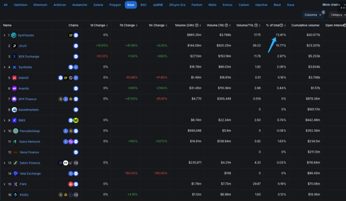 过去 24h 的交易量更是占到 Base 网络的 72%,接近第 2 名的 5 倍