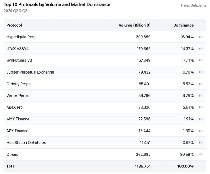 而如果我们把视角放到整个行业,可以看到 SynFutures V3 自上线以来的增长,相比 Hyperliquid、dYdX、Jupiter 等项目也毫不逊色。根据 DefiLlama 数据,Q2、Q3 链上永续合约交易量为 11857 亿美金,前 3 名占据超过 45% 的交易量,分别为 Hyperliquid (16.94%)、dYdX V3 & V4 (14.37%) 和 SynFutures (14.11%)。