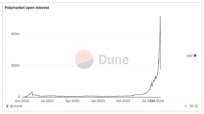 Polymarket 是一个基于 Polygon 区块链的预测市场,在选举期间它的采用量激增,选举赌注金额达到 32 亿美元,比选举前高出几个数量级。与其他预测市场相比,Polymarket 不收取任何费用,支持无缝交易,并且是去中心化的,这意味着任何人都可以通过 API 直接与链上的底层合约进行交易(允许任何人创建交易机器人),而且任何来自非黑名单地区的人都可以访问网站前端。