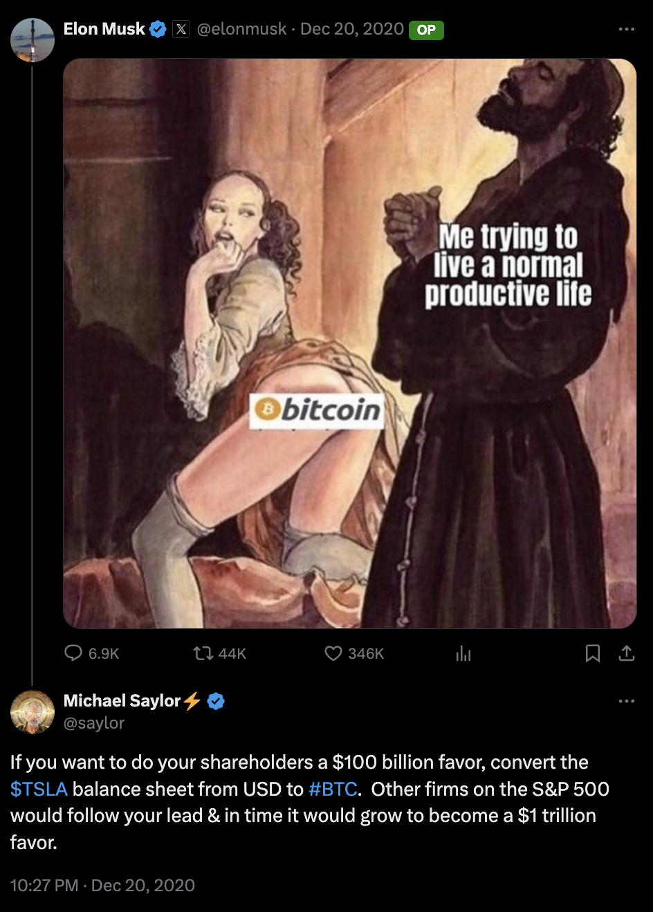 现在和特朗普称兄道弟的「马保国同志」马斯克四年前和加密货币还没有这么深的染指。2020 年 12 月,马斯克发了一张略显调侃的图片,一名修士双手合十、目光虔诚地向上凝望,却难以抵挡比特币的诱惑。Saylor 回复马斯克建议他为特斯拉股东「做一件价值千亿美元的大事」,将特斯拉的资产负债表从美元转换为比特币。