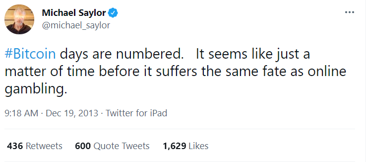 但这样一个疯狂买买买的比特币死忠粉在十年前曾说「比特币蹦跶不了几天了,这是早晚的事,它的下场跟在线赌博一样。」当时他还以为,比特币要么会被宣布非法从而被彻底禁掉,要么就比不上其他的加密货币,从而自己退出历史舞台。