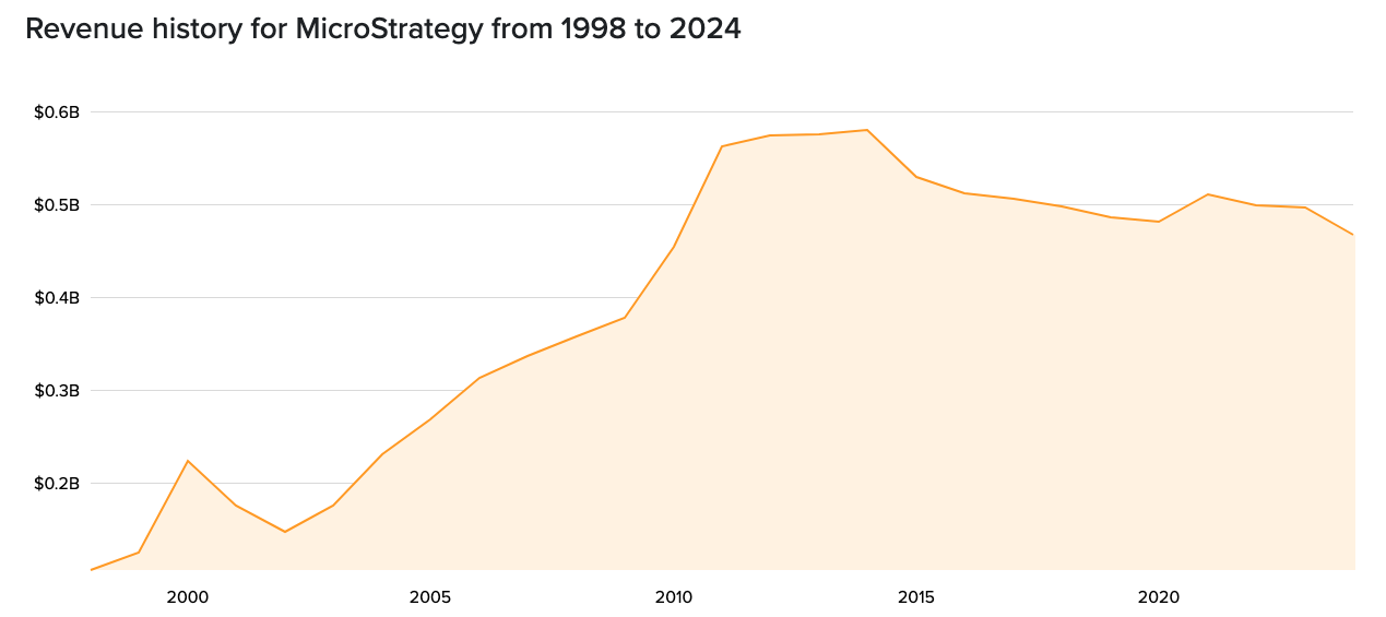 当时 Saylor 意识到,互联网具有强大的数据分析能力,可以帮助企业分析关于产品和市场的海量数据。很快,客户们开始每年向 MicroStrategy 支付几十万美元的费用,用于创建直观的图表,来显示一些直观的消费趋势,比如哪些消费者喜欢特定的饮料或者保险产品。