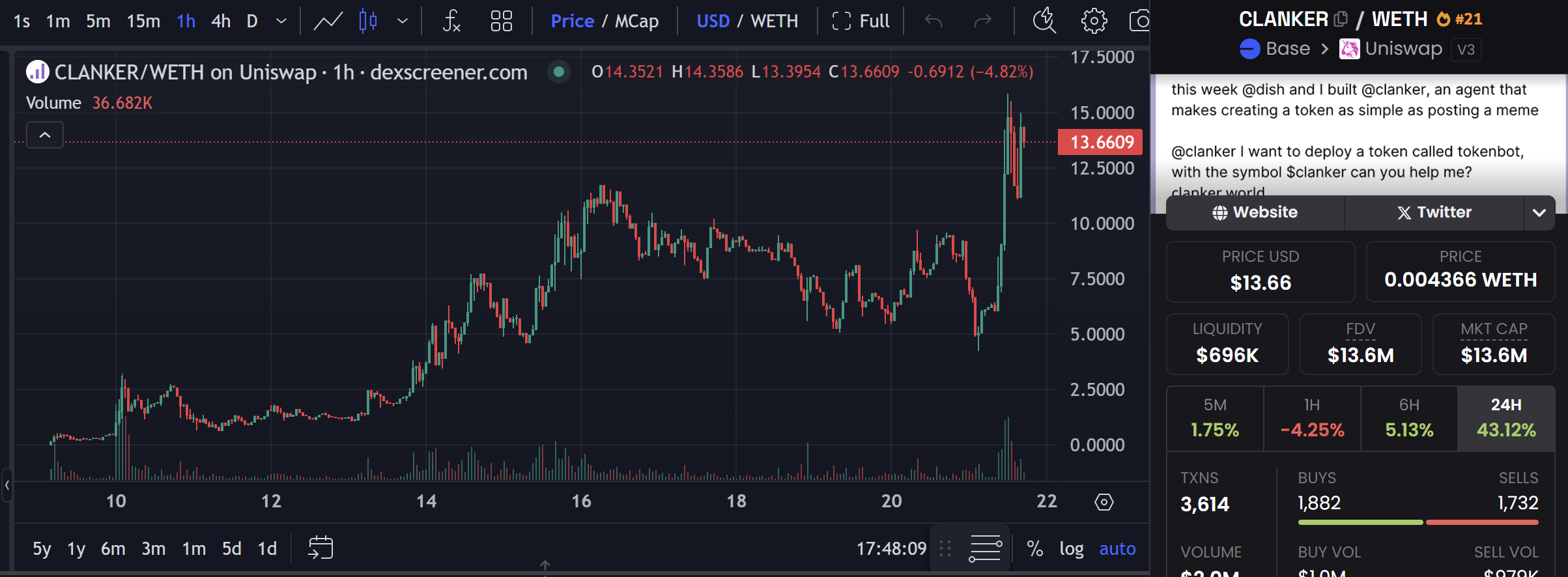 Clanker 是基于 Farcaster 的一款 AI 发币平台,简单理解为 farcaster 版本的 pump.fun。通过 Clanker 让代币资产的发行变得更加容易。其平台代币为 CLANKER,和 VIRTUAL 的情况如出一辙。基本上也是一路上涨,用拉盘征服所有 FUD 的人。虽然不比 VIRTUAL 2 亿的市值,但是刚突破 1000 万的门槛,在 Base 上也算是「初出新手村」。