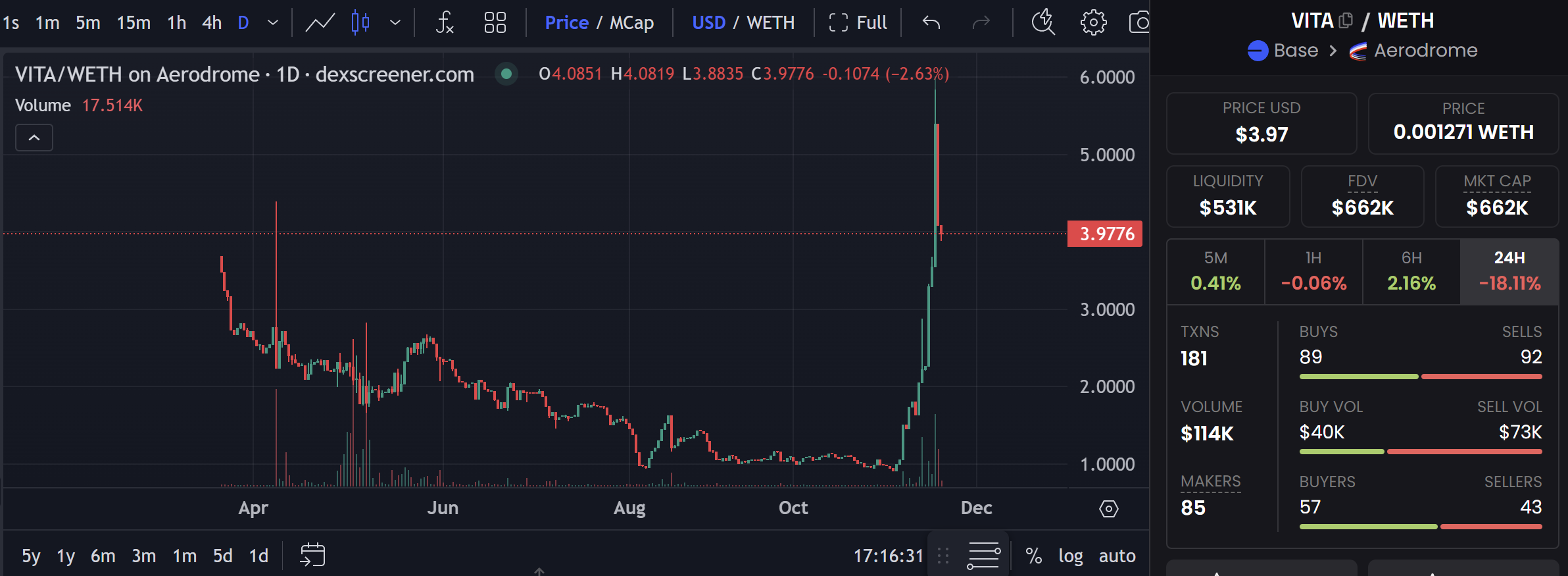 VitaDAO 早在今年 4 月因为 gas 的原因就已从以太坊主网迁移至 Base。VitaDAO 是一专注于资助早期的长寿研究的团体,曾接受过辉瑞的投资。VITA 的爆火还是因为有名人站台。在泰国 Devcon 期间 Vitalik 向 CZ 展示了 VitaDAO 的第一款产品 VD001,这种高剂量亚精胺产品可以用作长寿补剂。随后 CZ 表明「希望在明年看到 1000 个 Desci 项目」,VITA 也受该言论的影响在一周内从底部拉盘 5 倍,丝滑突破 1 亿市值。但是在 Base 上的表现平平。