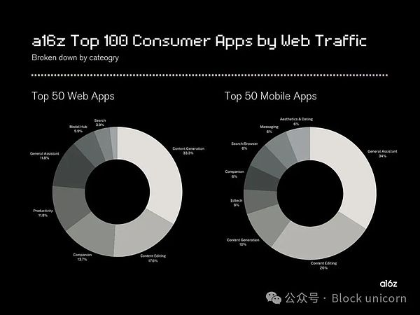 显然,内容生成和编辑工具在消费者级 AI 领域处于领先地位。