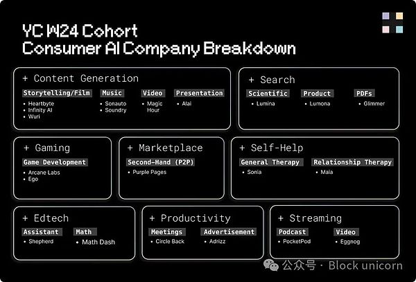 与 a16z 报告中的趋势类似,YC 的最新一批创业者正在探索高级的内容类型,包括讲故事、剧本到电影的生成、音乐、视频和以演示为主的内容。