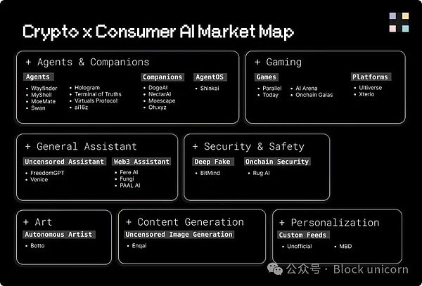 通用助手和内容生成工具在传统消费者级 AI 领域占据主导地位。然而,激烈的竞争使得进入这个市场充满挑战且成本高昂,这也解释了为什么这些类别在加密市场地图上的代表性不如传统 AI 中的地位强势。