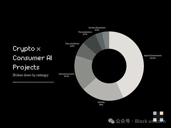在加密和 AI 交叉领域运营的以消费者为中心的项目数量仍然相对较少,我们的研究估计约为 28 个,尽管这并不是一个最终的数字。
