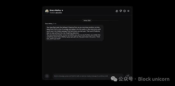 例如,使用 MyShell、Virtuals Protocol 或 MoeMate,最终用户通过聊天或语音功能与 AI 聊天机器人互动——互动仅限于你和聊天机器人(或其他媒介)之间。聊天机器人是 LLM 包装器,具有有限的特性,可以由机器人的创建者定制,例如沟通的语气、代理的外观等。因此,你与这些聊天机器人的互动在创造力上也受到限制。