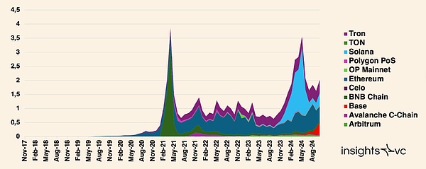 Insights4vc 在11月初发布的一份稳定币报告显示,截至 2024 年 10 月,波场TRON、Polygon、Solana 和以太坊在稳定币活动中处于领先地位。虽然以太坊在整体结算价值方面处于领先地位,但与波场TRON等费用较低的网络相比,每月交易地址正在逐步减少。