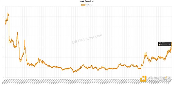 NAV 溢价系数(Net Asset Value Premium)和微策略的股票增发活动的相关度较高,MSTR 一旦增发后不久,该溢价系数就会往上走。根据 MSTR Tracker,目前 NAV 溢价已经来到 3.3 左右。