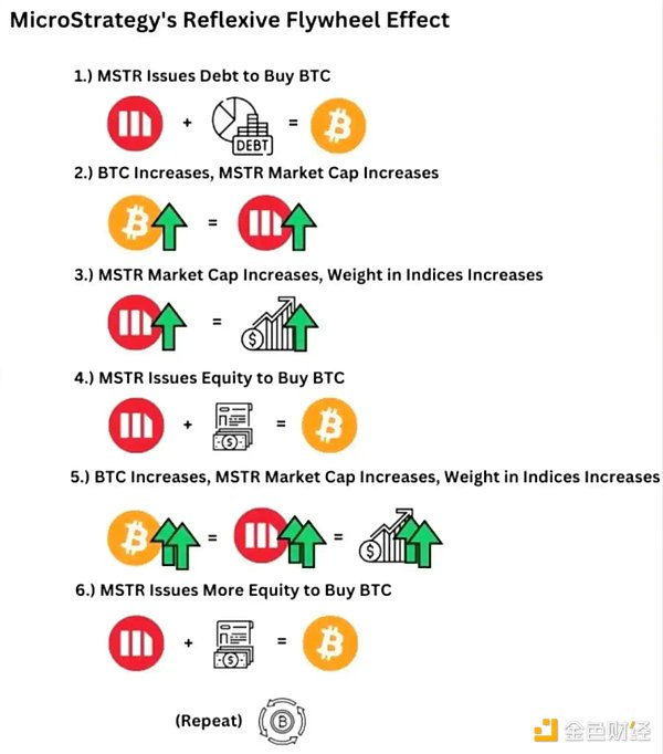 这时,公司增发 MSTR 股票,以溢价买入比股票对应量更多的比特币,这样每股 MSTR 所对应的 BTC 也就进一步上升,也就意味着公司的市值和 MSTR 的价值也会上涨,然后再循环往复,不断飞轮。