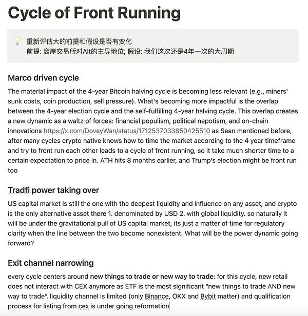 今年年初我们对行业结构变化进行了大量复盘,写下了这一篇内部报告“Cycle of Front Running”,TLDR:我们行业的两极化越来越严重了。一方面,行业体量变大,tradfi通过ETF等合规手段将大量crypto资产融入了华尔街,这一部分的流动性被抢走,且很难再转化为我们场内资金;另一方面,民粹资本主义的强烈扩张,注意力经济进一步压缩,整个金融化过程愈发简单粗暴,最crypto native的方式变成了直接炒meme,这也是tradfi无法触及的领域。
